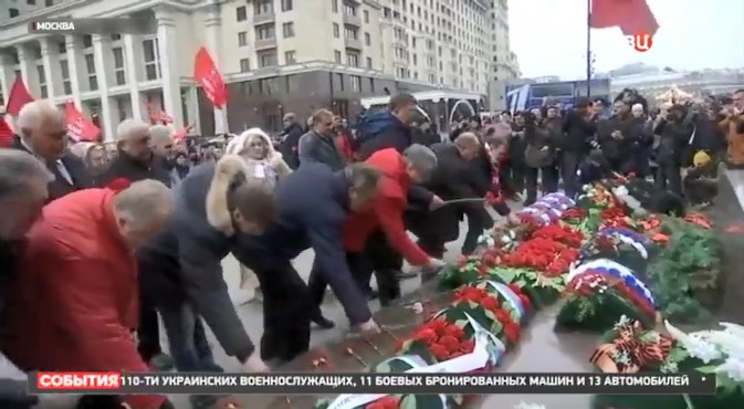 «После того, как стартовала последняя фура на Донбасс, лидер коммунистов отправился на Красную площадь, возложил цветы к Мавзолею Ленина. Говорил в 105-ю годовщину Октябрьской революции об Украине.