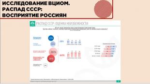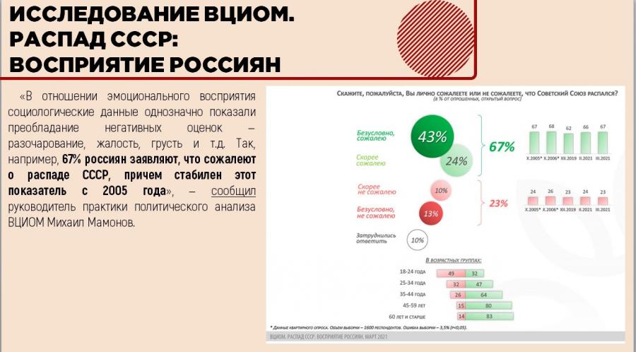 2. Правительственный ВЦИОМ представил выводы своего исследования мнения граждан России в связи с ликвидацией СССР. «В отношении эмоционального восприятия социологические данные однозначно показали преобладание негативных оценок — разочарование, жалость, грусть и т.д. Так, например, 67% россиян заявляют, что сожалеют о распаде СССР, причем стабилен этот показатель с 2005 года», — сообщил руководитель практики политического анализа ВЦИОМ Михаил Мамонов.