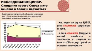 Как видно, из опроса ЦИПКР, доля пессимистов в ответе на вопрос о возможности возрождения нового Союза сократилась в 2022 году на треть, в сравнении с прошлым годом. А вот доля оптимистов (твердых и мягких) колеблется в зависимости от ситуации на фронтах СВО от двух третей до половины респондентов. Хотя пробуксовка СВО сказалась на сокращении доли оптимистов.