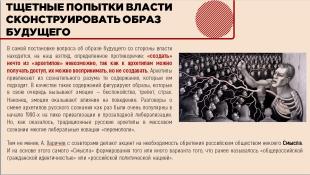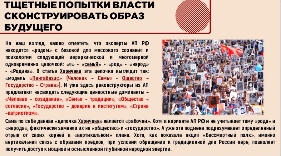 Власть, не предлагая реального образа будущего, пытается заместить стихийно транслируемый ею образ олигархического успеха и беспредела на приватизированный позитив из опыта СССР. Отсюда формальное заимствование советских практик и символов, прикрывающих ее неэффективность и несправедливость.