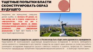 4. Умышленно или неумышленно совершена данная концептуальная ошибка, но эксперты АП делают, на наш взгляд, шаг в сторону «суррогатов» и «виртуальности», тогда как уже в ближайшем будущем именно за живую, непосредственную реальность в противовес различного рода «виртуальным реальностям» и будет идти борьба, в том числе борьба идеологическая.