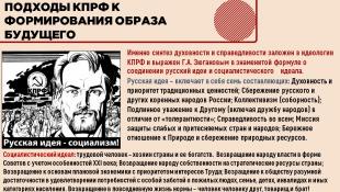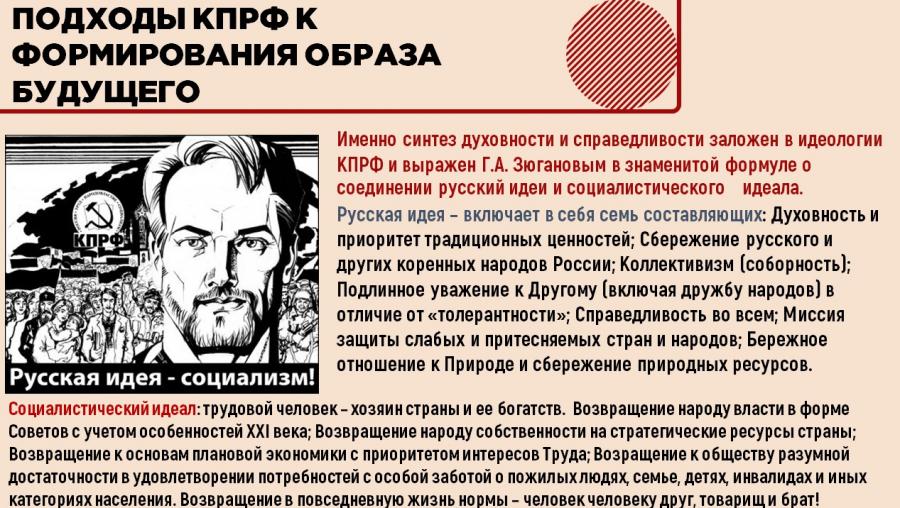 Именно синтез духовности и справедливости заложен в идеологии КПРФ и выражен Г.А. Зюгановым в знаменитой формуле о соединении русский идеи и социалистического идеала.