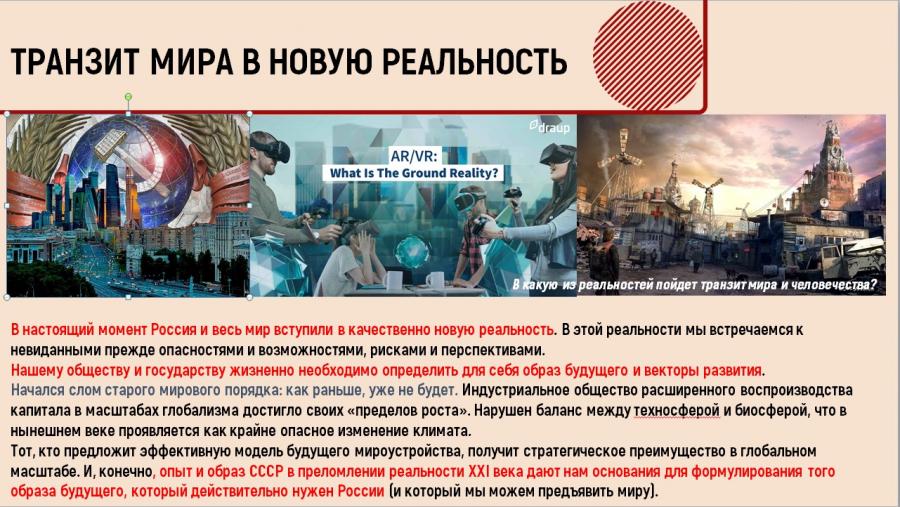 Тот, кто в нынешнюю глобальную турбулентность предложит эффективную модель будущего мироустройства, получит стратегическое преимущество в планетарном масштабе. И, конечно, опыт и образ СССР в преломлении реальности XXI века дают нам основания для формулирования того образа будущего, который действительно нужен России. И который мы можем предъявить миру.