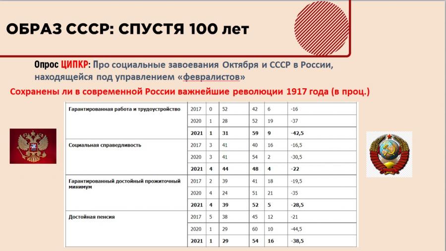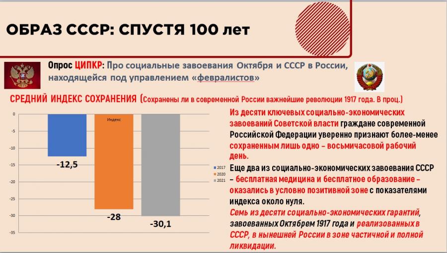 Семь из десяти социально-экономических гарантий, завоеванных Октябрем 1917 года и реализованных в СССР, как считает большинство граждан современной России, в нынешней РФ в зоне частичной и полной ликвидации.