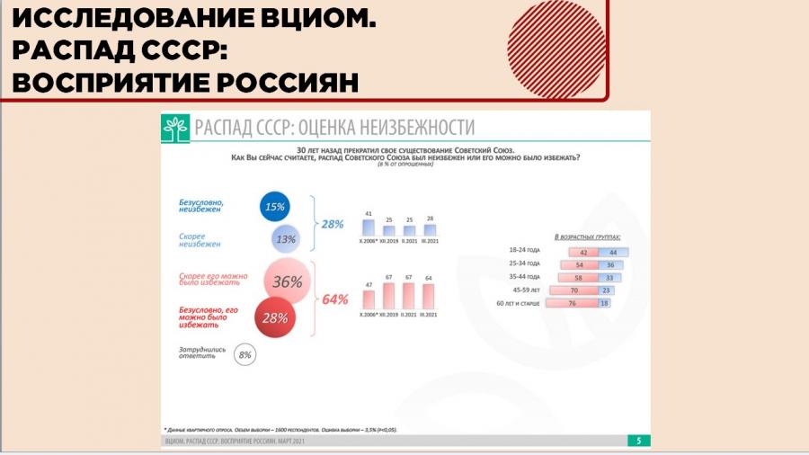 И еще данные ВЦИОМ: 64% россиян сегодня уверены – распада СССР можно было избежать! Более того, если бы референдум о сохранении СССР проходил сегодня, то 73% жителей современной Российской Федерации проголосовали бы «за» сохранение.