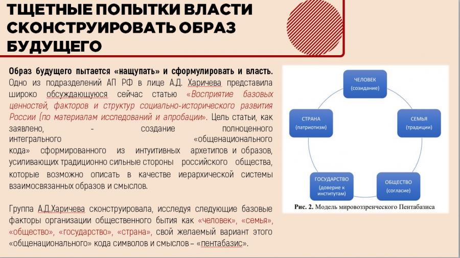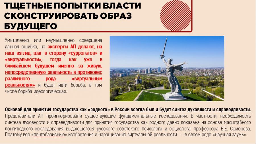 На наш взгляд, основой для принятия государства как «родного» в России всегда был и будет синтез духовности и справедливости. Представители АП проигнорировали существующие фундаментальные исследования. В частности, необходимость синтеза духовности и справедливости для принятия государства как родного давно доказана на основе масштабного лонгитюдного исследования выдающегося русского советского психолога и социолога, профессора В.Е. Семенова. Поэтому все «пентабазисные» изобретения по наращивание виртуальной реальности – в своем роде «научная заумь».
