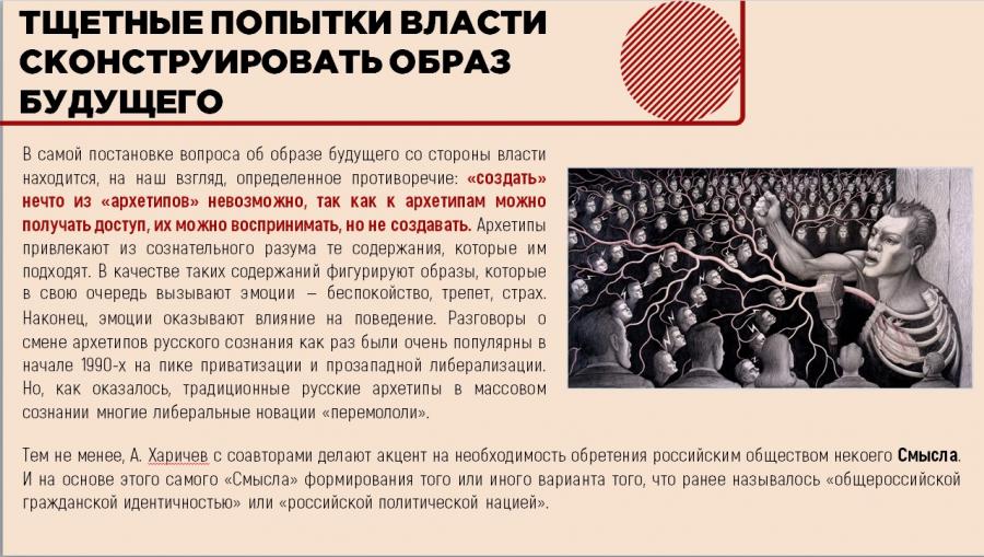 2.В самой постановке вопроса об образе будущего со стороны власти находится, на наш взгляд, определенное противоречие: «создать» нечто из «архетипов» невозможно, так как к архетипам можно получать доступ, их можно воспринимать, но не создавать. Архетипы привлекают из сознательного разума те содержания, которые им подходят. В качестве таких содержаний фигурируют образы, которые в свою очередь вызывают эмоции — беспокойство, трепет, страх. Наконец, эмоции оказывают влияние на поведение. Разговоры о смене архетипов русского сознания как раз были очень популярны в начале 1990-х на пике приватизации и прозападной либерализации. Но, как оказалось, традиционные русские архетипы в массовом сознании многие либеральные новации «перемололи».
