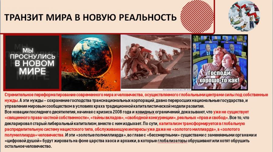 2. Стремительное переформатирование современного мира и человечества, осуществляется глобальными центрами силы под собственные нужды. А эти нужды – сохранение господства транснациональных корпораций, давно переросших национальные государства, и управления мировым сообществом в условиях краха традиционной капиталистической модели развития.