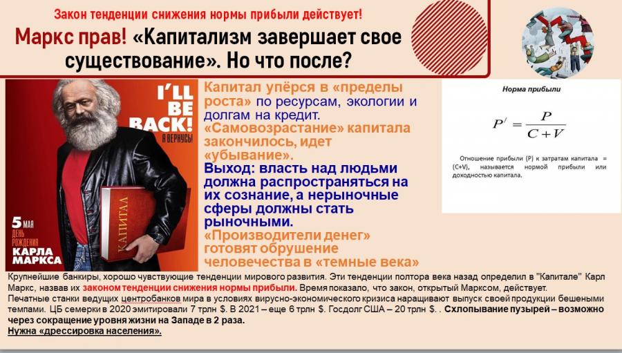 Время показало, что закон, открытый Марксом, действует. Хотя даже Маркс не мог представить, что будут отрицательные процентные банковские ставки, отрицательные значения фьючерсов на сырье. Некий выход, как задержать объективный ход исторического процесса, хозяева глобальных корпораций нашли. Их власть над людьми должна распространяться не только через материальное производство и финансовые рычаги, но и через капитализацию и включение в рыночный оборот ранее нерыночных сфер – от образования и здравоохранения до системы научных престижей и от личной, интимной жизни человека до информации о его поведении и контроля над сознанием. «Производители денег», главы глобальных ТНК и финансовых монстров готовы обрушить абсолютного большинства человечества в «темные века» лишь бы сохранить свой глобальный контроль над планетой, человечеством и ключевыми ресурсами.