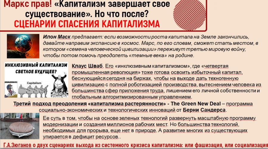 В ответ на эти планы/сценарии просто вновь напомним емкий и глобальный вывод Г.А.Зюганова о двух сценариях выхода из системного кризиса капитализма: или фашизация, или социализация