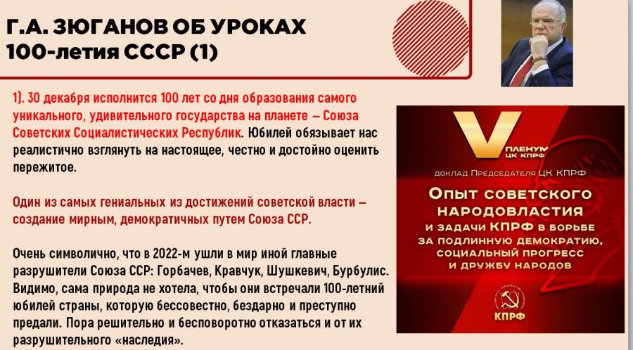 1. 30 декабря исполнится 100 лет со дня образования самого уникального, удивительного государства на планете — Союза Советских Социалистических Республик. Юбилей обязывает нас реалистично взглянуть на настоящее, честно и достойно оценить пережитое.