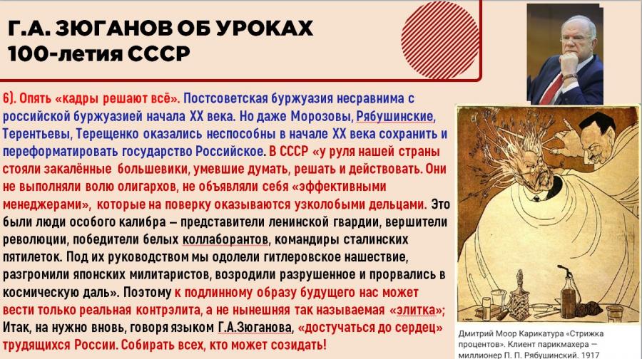 5. Опять «кадры решают всё». Постсоветская буржуазия несравнима по своему созидательному уровню с российской буржуазией начала XX века. Но даже лучшие ее представители - Морозовы, Рябушинские, Терентьевы, Терещенко - оказались неспособны в начале ХХ века сохранить и переформатировать государство Российское. Миссию спасения взяли на себя большевики, вставшие во главе рабочего класса и привлекшие к созиданию лучших представителей свергнутых классов и слоев. В СССР, как справедливо отмечает Г.А.Зюганов, «у руля нашей страны стояли закалённые большевики, умевшие думать, решать и действовать. Они не выполняли волю олигархов, не объявляли себя «эффективными менеджерами», которые на поверку оказываются узколобыми дельцами. Это были люди особого калибра — представители ленинской гвардии, вершители революции, победители белых коллаборантов, командиры сталинских пятилеток. Под их руководством мы одолели гитлеровское нашествие, разгромили японских милитаристов, возродили разрушенное и прорвались в космическую даль». Поэтому к подлинному образу будущего нас может вести только реальная контрэлита, а не нынешняя так называемая «элитка»;