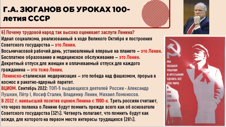 6. В связи со 100-летием СССР нужно ответить и на вопрос: «Почему трудовой народ так высоко оценивает заслуги Ленина?» Лидер КПРФ дает такой ответ.