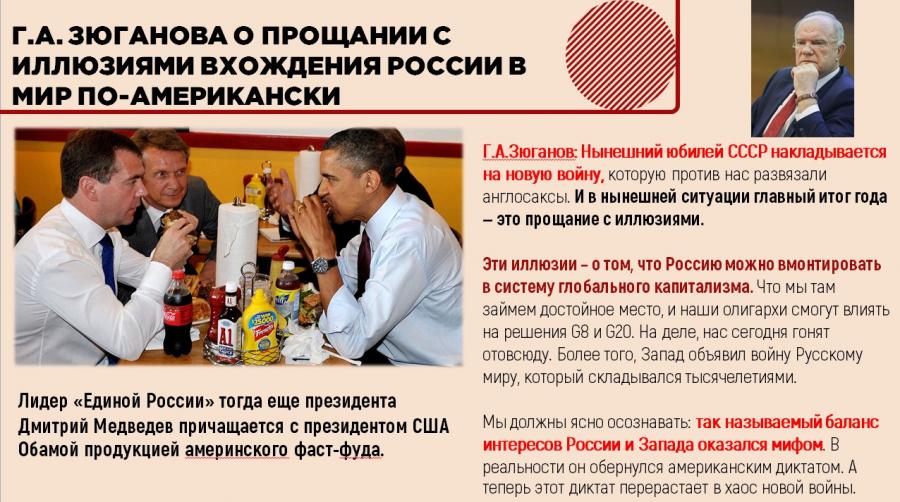 7. Сто лет назад, СССР оказался в тотальной западной блокаде. Но выстоял и победил. Лидер КПРФ Г.А.Зюганов справедливо отмечает сходство с сегодняшним геополитическим положением Российской Федерации: «Нынешний юбилей СССР накладывается на новую войну, которую против нас развязали англосаксы. И в нынешней ситуации главный итог года — это прощание с иллюзиями. Эти иллюзии – о том, что Россию можно вмонтировать в систему глобального капитализма. Что мы там займем достойное место, и наши олигархи смогут влиять на решения G8 и G20. На деле, нас сегодня гонят отовсюду. Более того, Запад объявил войну Русскому миру, который складывался тысячелетиями».