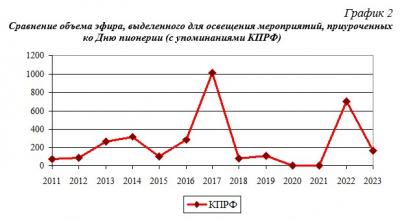 Сравнение объема эфира, выделенного для освещения мероприятий, приуроченных ко Дню пионерии (с упоминаниями КПРФ)