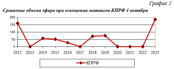 Таким образом, в 2023 году объём освещения мероприятий КПРФ 4 октября резко возрос и оказался больше, чем был в любом другом году. В 2013, 2017 и 2020-2022 гг. на телеканалах не выходили сюжеты, посвящённые мероприятиям КПРФ к годовщине 1993 г.