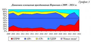 1-2 мая 2024 года на пяти центральных федеральных каналах вышло пять телесюжетов, в которых освещалось празднование Первомая и при этом упоминались политические парламентские партии. По два сюжета было показано на «России» и «Первом» и один на ТВЦ (в кадре мелькали красные флаги и Г. Зюганов, но словами Компартия не упоминалась). Телеканалы НТВ и Рен-ТВ не упоминали в этот день акции ни одной из пяти парламентских партий.