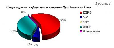 Наибольшее количество эфирного времени при освещении Первомая среди парламентских партий получила акция КПРФ (56% или 3 минуты 3 секунды).