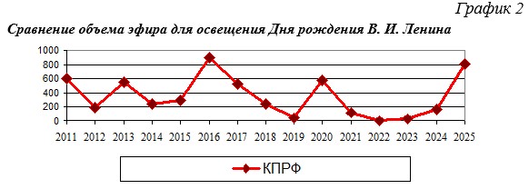 Всего освещение федеральным телевидением мероприятий КПРФ ко Дню рождения В. И. Ленина заняло 13 минут 32 секунды, тогда как в прошлом году было 2 минуты 48 секунд. Распределение времени по телеканалам отражено на Графике 1.