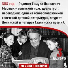 3 ноября 1887 года родился Самуил Яковлевич Маршак — советский поэт, драматург и переводчик, один из основоположников советской детской литературы, лауреат Ленинской и четырёх Сталинских премий.