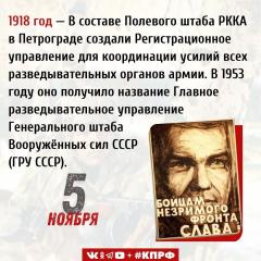 5 ноября 1918 года — в Петрограде в составе Полевого штаба Реввоенсовета Советской Республики было создано Регистрационное управление для координации усилий всех разведывательных органов Красной армии, которое после многих переименований в 1953 году получило название Главное разведывательное управление Генерального штаба Вооружённых сил СССР (ГРУ СССР). Эта дата считается Днём военного разведчика.