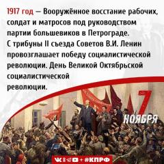 7 ноября 1917 года произошло Вооружённое восстание рабочих, солдат и матросов под руководством партии большевиков в Петрограде. C трибуны Второго съезда Советов В.И. Ленин объявил о победе социалистической революции. Этот день вошел в историю как День Великой Октябрьской социалистической революции.