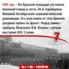 7 ноября 1941 года в Москве на Красной площади состоялся военный парад в честь 24-й годовщины Великой Октябрьской социалистической революции. Его участники от стен Кремля уходили прямо на фронт. Перед ними с трибуны Мавзолея В.И. Ленина с речью выступил И.В. Сталин.