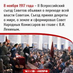 8 ноября 1917 года II Всероссийский съезд Советов объявил о переходе всей власти Советам. Съезд принял декреты о мире, о земле и сформировал первое Советское правительство – Совет Народных Комиссаров во главе с В.И. Лениным.