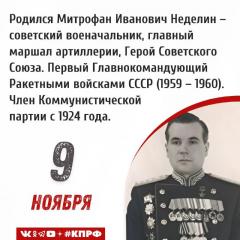 9 ноября 1902 года – родился Митрофан Иванович Неделин – советский военачальник, главный маршал артиллерии, Герой Советского Союза. Первый Главнокомандующий Ракетными войсками СССР (1959 – 1960). Член Коммунистической партии с 1924 года.