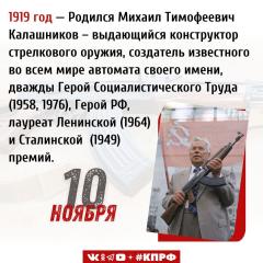 1919 год - Родился Михаил Тимофеевич Калашников - выдающийся конструктор стрелкового оружия, создатель известного во всем мире автомата своего имени, дважды Герой Социалистического Труда (1958, 1976), Герой РФ, лауреат Ленинской (1964) и Сталинской (1949) премий.