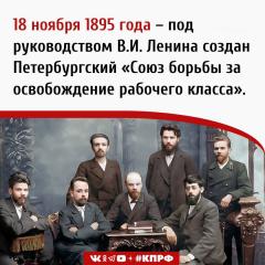 18 ноября 1895 года – по почину и под руководством В.И. Ленина создан Петербургский «Союз борьбы за освобождение рабочего класса» – политическая социал-демократическая организация, объединившая марксистские рабочие организации Петербурга.