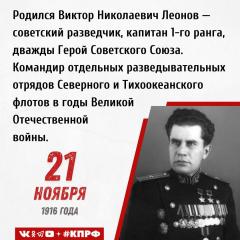 21 ноября 1916 года родился Виктор Николаевич Леонов — советский разведчик, капитан 1-го ранга, дважды Герой Советского Союза. Командир отдельных разведывательных отрядов Северного и Тихоокеанского флотов в годы Великой Отечественной войны.