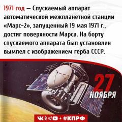 19 мая 1971 года с космодрома «Байконур» с помощью ракеты-носителя «Протон-К» отправилась к Марсу автоматическая межпланетная станция «Марс-2». Целью полета было исследование атмосферы и поверхности планеты. На борту спускаемого аппарата был установлен вымпел с изображением Государственного герба СССР для доставки его на Красную планету. Благодаря разработанной советскими учеными автономной навигационной системе АМС без вмешательства с Земли корректировала свой полет. За 6 месяцев станция долетела до Марса в штатном режиме.