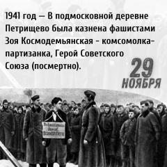 29 ноября 1941 года в подмосковной деревне Петрищево казнена фашистами комсомолка-партизанка Зоя Космодемьянская. В тот же день в деревне Головково была казнена её подруга, разведчица из того же отряда Вера Волошина.