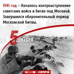 5 декабря 1941 года началось контрнаступление советских войск в битве под Москвой. 3авершился оборонительный период Московской битвы. Немецкий план окружения и захвата советской столицы потерпел полный провал.