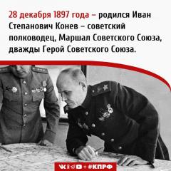 28 декабря 1897 года родился Иван Степанович Конев – советский полководец, Маршал Советского Союза (1944), дважды Герой Советского Союза (1944, 1945). В годы Великой Отечественной войны войска под его руководством участвовали в Московской и Курской битвах, в боях за освобождение Польши, в Берлинской операции. Член Коммунистической партии с 1918 г.