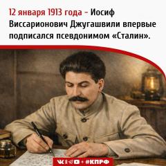 12 января 1913 года Иосиф Джугашвили впервые подписался псевдонимом «Сталин».