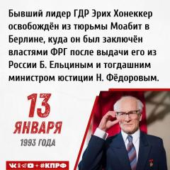 13 января 1993 года – бывший лидер ГДР и первый секретарь Социалистической единой партии Германии Эрих Хонеккер освобождён из тюрьмы Моабит в Берлине, куда он был заключён властями ФРГ после выдачи его из России Б. Ельциным и тогдашним министром юстиции Н. Фёдоровым.