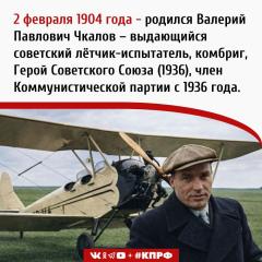 2 февраля 1904 года родился Валерий Павлович Чкалов – выдающийся советский лётчик-испытатель, комбриг, Герой Советского Союза (1936), член Коммунистической партии с 1936 года.