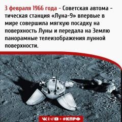 3 февраля 1966 года – Советская автоматическая станция «Луна-9» впервые в мире совершила мягкую посадку на поверхность Луны и передала на Землю панорамные телеизображения лунной поверхности.