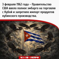 3 февраля 1962 года – После ряда предварительных ограничений правительство США ввело полное эмбарго на торговлю с Кубой и запретило импорт продуктов кубинского производства.