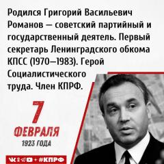 7 февраля 1923 года родился Григорий Васильевич Романов — советский партийный и государственный деятель. Первый секретарь Ленинградского обкома КПСС (1970—1983), член Политбюро ЦК КПСС (1976—1985), секретарь ЦК КПСС (1983—1985 гг.), Герой Социалистического труда (1983). Член КПРФ, член Центрального консультативного совета при ЦК КПРФ.