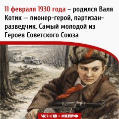 11 февраля 1930 года родился Валя Котик — пионер-герой, партизан-разведчик. Самый молодой из Героев Советского Союза.