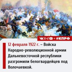 1922 год – Войска Народно-революционной армии Дальневосточной республики разгромили белогвардейцев под Волочаевкой.