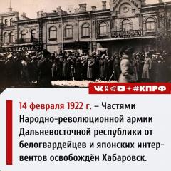 14 февраля 1922 года – Войска Народно-революционной армии Дальневосточной республики освободили Хабаровск от белогвардейцев и японских интервентов.