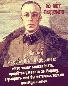 Пройдя через 13 концлагерей и тюрем, он выиграл свою войну. Ту, в которой главным оружием является не винтовка, а воля. На пьедестале памятника Д. М. Карбышеву перед железными воротами бывшего концлагеря Маутхаузен на русском и немецком языках высечены такие слова: