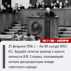 25 февраля 1956 года – На закрытом заседании XX съезда КПСС Н.С. Хрущёв зачитал доклад «О культе личности и его последствиях», положивший начало дискредитации И. В. Сталина.