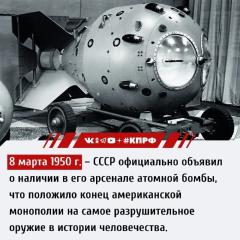 8 марта 1950 года – СССР официально объявил о наличии в его арсенале атомной бомбы, что положило конец американской монополии на самое разрушительное оружие в истории человечества.