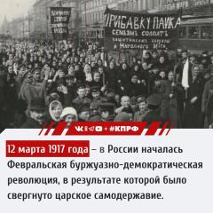12 марта (27 февраля) 1917 года – В России началась Февральская буржуазно-демократическая революция, в результате которой было свергнуто царское самодержавие. Образован Петроградский Совет рабочих и солдатских депутатов.