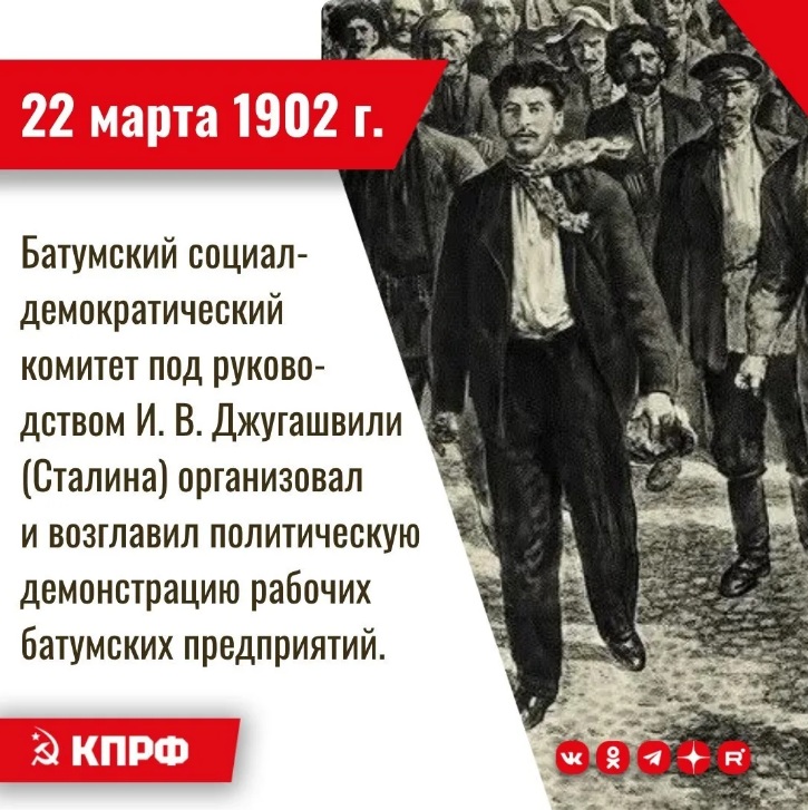 22 марта 1902 года – Батумский социал-демократический комитет под руководством И. В. Джугашвили (Сталина) организовал и возглавил политическую демонстрацию рабочих батумских предприятий.
